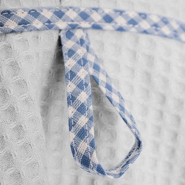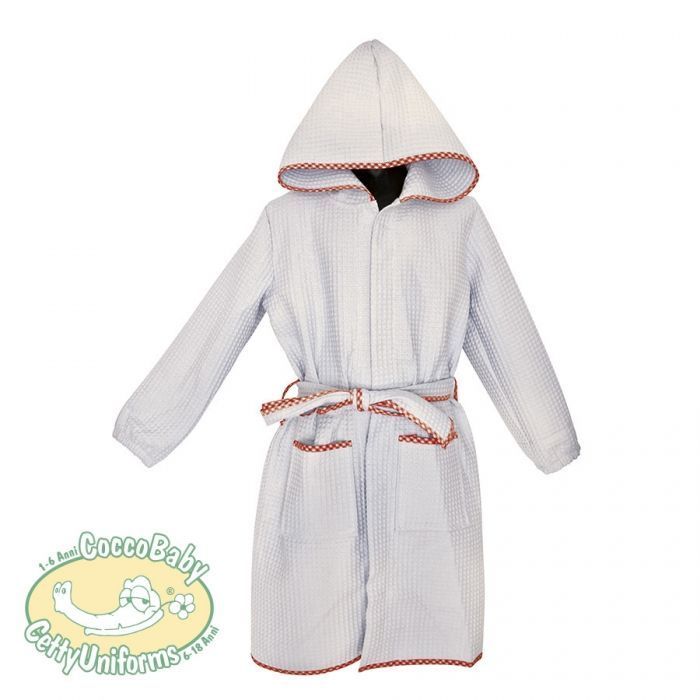 Accappatoio per bambini con tessuto in nido d'ape 100% cotone. Ideale per le attività sportive, la scuola o la piscina. Accappatoio Bianco con cintura, tasche, cappuccio e asola interna per appenderlo. Profilo (bordo) a scelta tra vari colori.