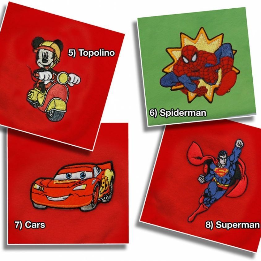 Davanti puoi scegliere la personalizzazione dello stemma ricamato, con i personaggi famosi per i bambini, Hello Kitty, Violetta, Minnie, Spiderman, Cars, Superman e i Minions. La versione di stemma che prevede più fantasie sara usata quella secondo la nostra disponibilità (Hello Kitty, Frozen, Minnie, Minions).