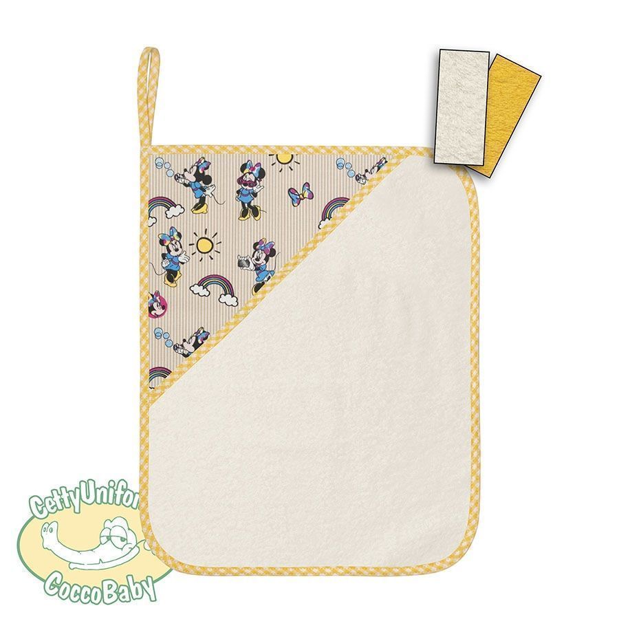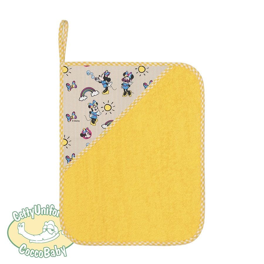 Asciugamano piccolo per asilo e scuola con fantasia "Minnie con arcobaleno", con asola di 8 cm per appenderlo (30x38 cm). Colore di spugna Panna o Gialla con bordo a quadretti di colore giallo.