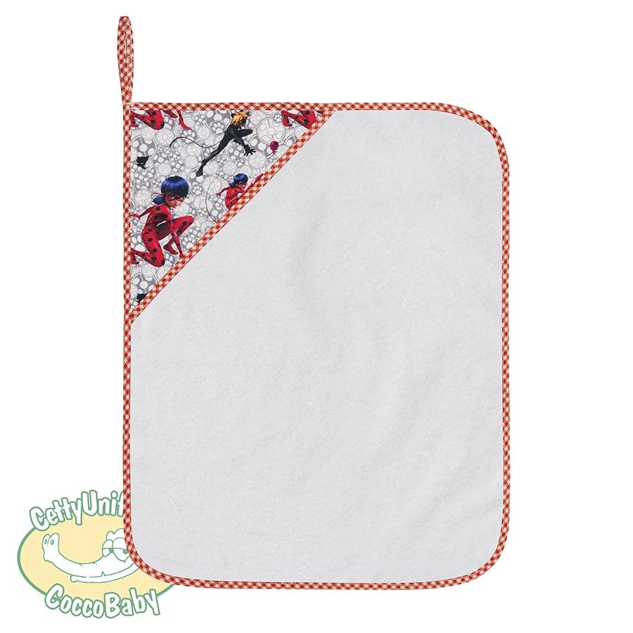Asciugamano asilo con fantasia Be Miraculous Ladybug e chat noir (lady coccinella) su sfondo grigio/bianco, con asola di 8 cm per appenderlo (43x54 cm). Colore di spugna bianca con bordo a quadretti rossi.