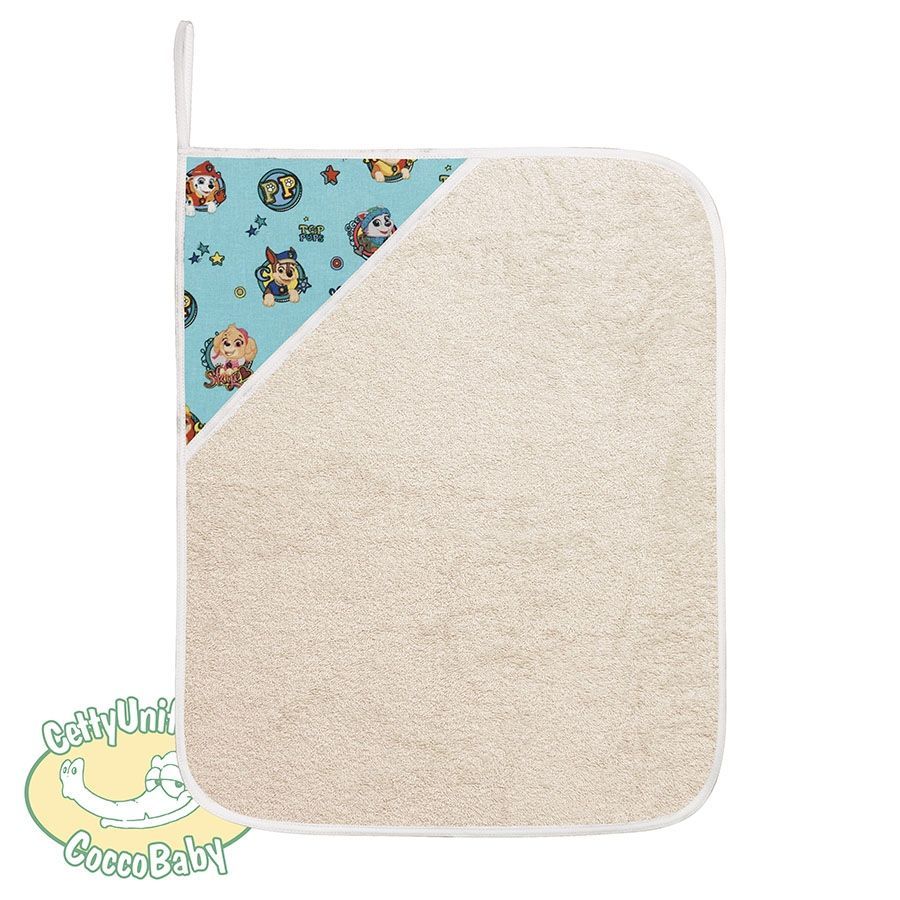 Asciugamano asilo con fantasia Paw Patrol Pups su sfondo turchese, con asola di 8 cm per appenderlo (43x54 cm).
