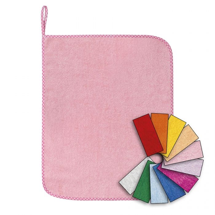 Asciugamano asilo "Semplice", con Asola di 8 cm per appenderlo (43x54 cm), disponibile in svariati colori allegri con bordo a quadretti in tono.