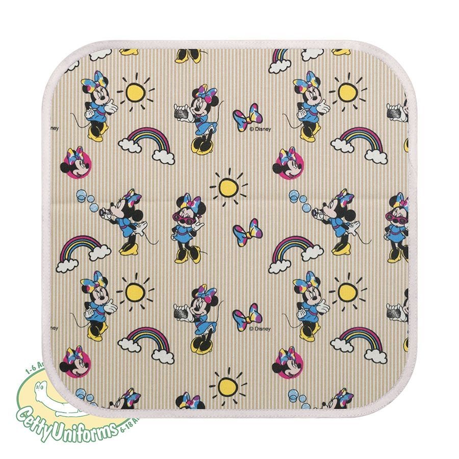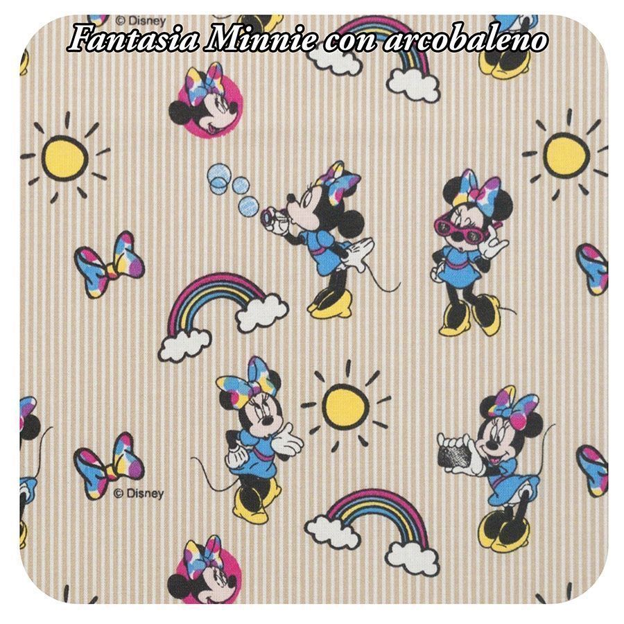 Tovagliolo con fantasia "Minnie con arcobaleno" su sfondo panna a righe beige con bordo bianco.
